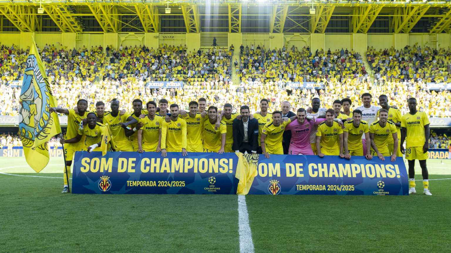 Un ambiente espectacular en las gradas y 20.000 banderas al viento mientras retumbaba el himno del Villarreal ejercieron como carta de presentación de un partido con muchos alicientes, aunque ninguno en el plano deportivo. Celebración, alegría y emociones a flor de piel también para despedir a algunos miembros de la plantilla, que ponen fin a su etapa como futbolistas amarillos. Algunos tan destacados como el propio Raúl Albiol, para el que hubo homenajes por parte de la afición, el club y sus propios compañeros.